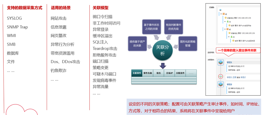 检验日审功能的另一个试金石是关联分析能力。针对日志自动化、集中度、关联度不够的问题,evo视讯真人官网DCSSA日志审计系统支持基于规则、统计、情报的分析模型,内置丰富的安全策略模板、高效的实时关联分析能力、灵活的审计策略,充分发挥日志分析及审计机制的最大效力。帮用户实现对日志的关联性处理,让用户能有效处理纷杂无序的日志信息。